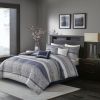 Give your bedroom a new luxurious look with the Madison Park Rhapsody 7 Piece Jacquard Comforter Set. This jacquard comforter features a navy and grey stripe design of several different motifs on the face with a solid grey reverse, for a chic transitional look. The 2 matching shams complement the design of the comforter to complete this glam comforter set. Also included is a solid navy bed skirt and 3 decorative pillows with embroidery and pleated details provide the finishing touches. Machine washable for easy care, this jacquard comforter set brings a sophisticated update to your bedroom decor. Items in the set may come in a rolled or compressed packaging, which will need to be fluffed up or steam ironed before use to remove wrinkles.