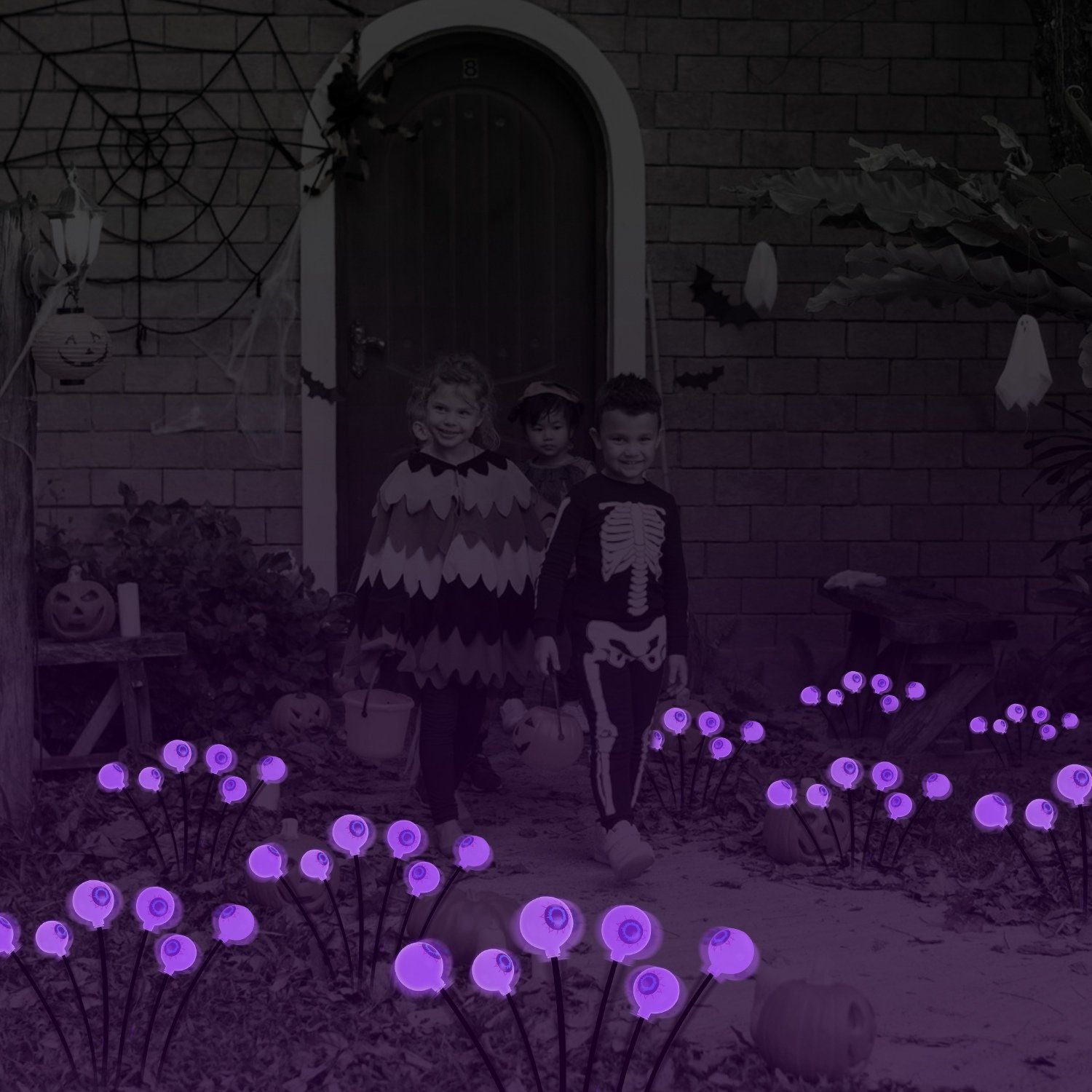 Our Halloween lights have 2packs with total 12 LED scary eyeball swaying lights. Perfect for use lighting up your Halloween, scaring your neighbors and passersby! The 3D eyeballs and swaying design appear more three-dimensional and realistic. The bloodshot eyes are perfectly combined with the eerie green/purple glow, easily create a horror atmosphere! You can adjust static lighting mode or flashing lighting mode as desired. After fully charged about 6-8 hours during day, it can work above 10hours at night. IP65 Waterproof performance makes it great for outdoor use without worrying about rainy day. Perfect to install them in your yard, garden, patio, front porch, etc..