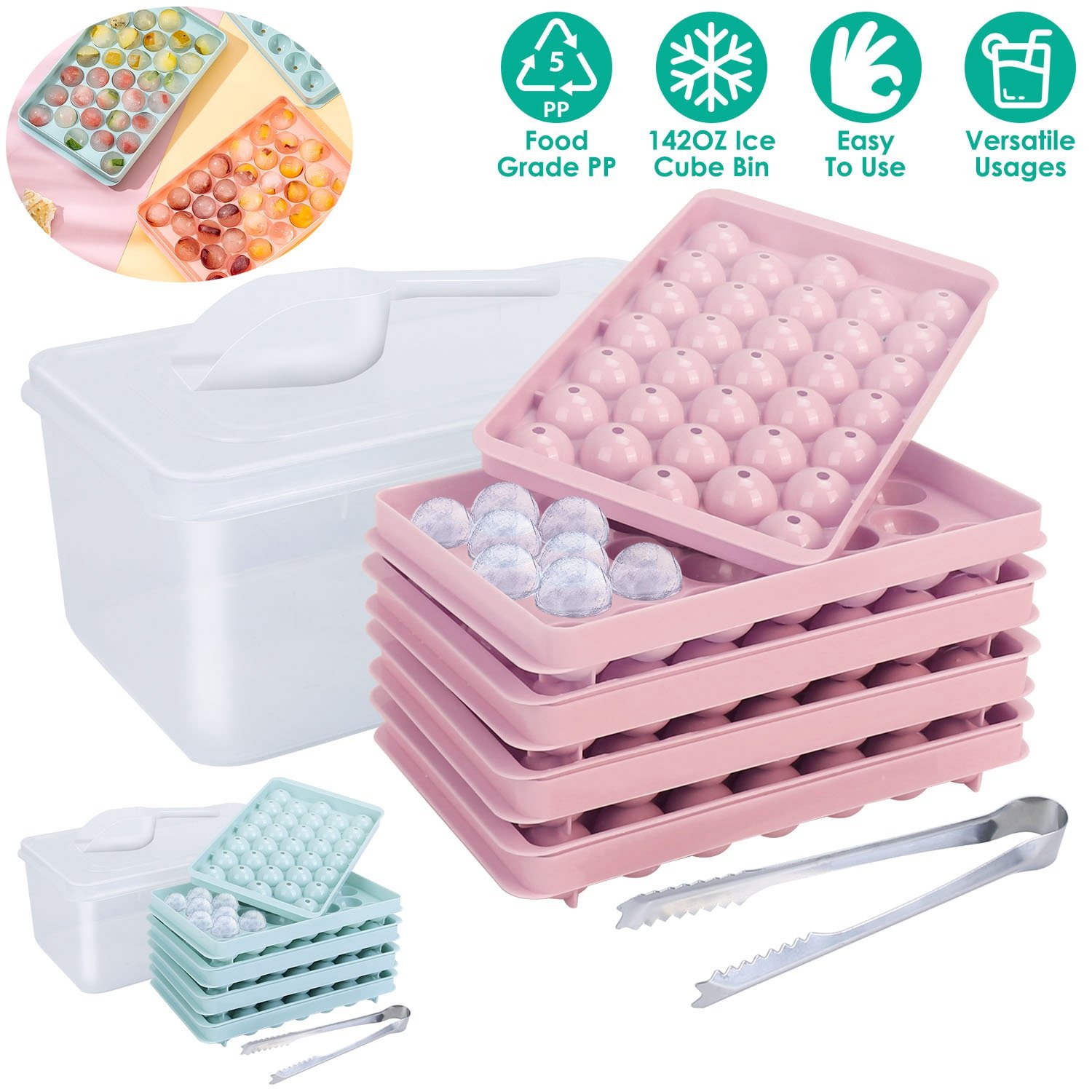 Do you like icy beverage and want to enjoy ice drinks anytime anywhere? Our 4 packs ice cube trays make ice small and fun, which is an easy and effective tool to get the ice balls in a short time than other standard ice trays. Food grade PP material makes it safe, non-toxic and durable for a long time use. With 4 trays and an ice cube container, you can make 132Pcs ice balls at one time and store about 400pcs ice balls in the ice bin to DIY your desired drink anytime with included ice scoop and ice tong.