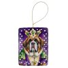 Porcelain Ornament featuring breed specific Saint Bernard artwork. Celebrate Mardi Gras with this Mardi Gras Ornament. Add a unique, personal touch to your holiday decor with our Rectangular Lattice Porcelain Ornament. Perfect for creating cherished memories, this high-quality ornament shines under festive lights, reflecting warmth and joy throughout your Christmas tree. Crafted with a glossy finish, it showcases vibrant, full-color artwork contributed by our talented artists, ensuring your tree is adorned with a burst of color and holiday spirit. What sets this Porcelain Ornament apart is its customizable white back. Use a paint pen or permanent marker to write a heartfelt message, commemorate a special year, or mark an unforgettable date, turning this ornament into a keepsake that will be treasured for years to come. For best results, allow any personalization to dry thoroughly before handling. Each ornament comes complete with a delicate gold cord, making it easy to hang and display. Proudly made in the USA, this ornament measures 3.375 x 2.625 inches and is a thoughtful gift for pet sitters, teachers, family members, or anyone who would appreciate a little extra holiday magic. Bring style, charm, and a touch of personal meaning to your Christmas tree with this beautifully designed ornament..